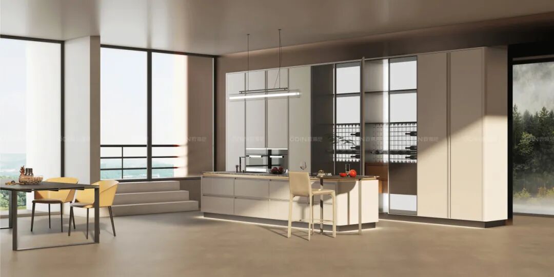 全屋定制可實現(xiàn)柜體、墻面、地面的色彩與材質的無縫銜接。例如,柜門采用與墻面同色系的PET高光板,搭配木地板的魚骨拼貼,視覺上延伸空間感;櫥柜的巖板臺面與中島臺的材質呼應,提升整體質感。