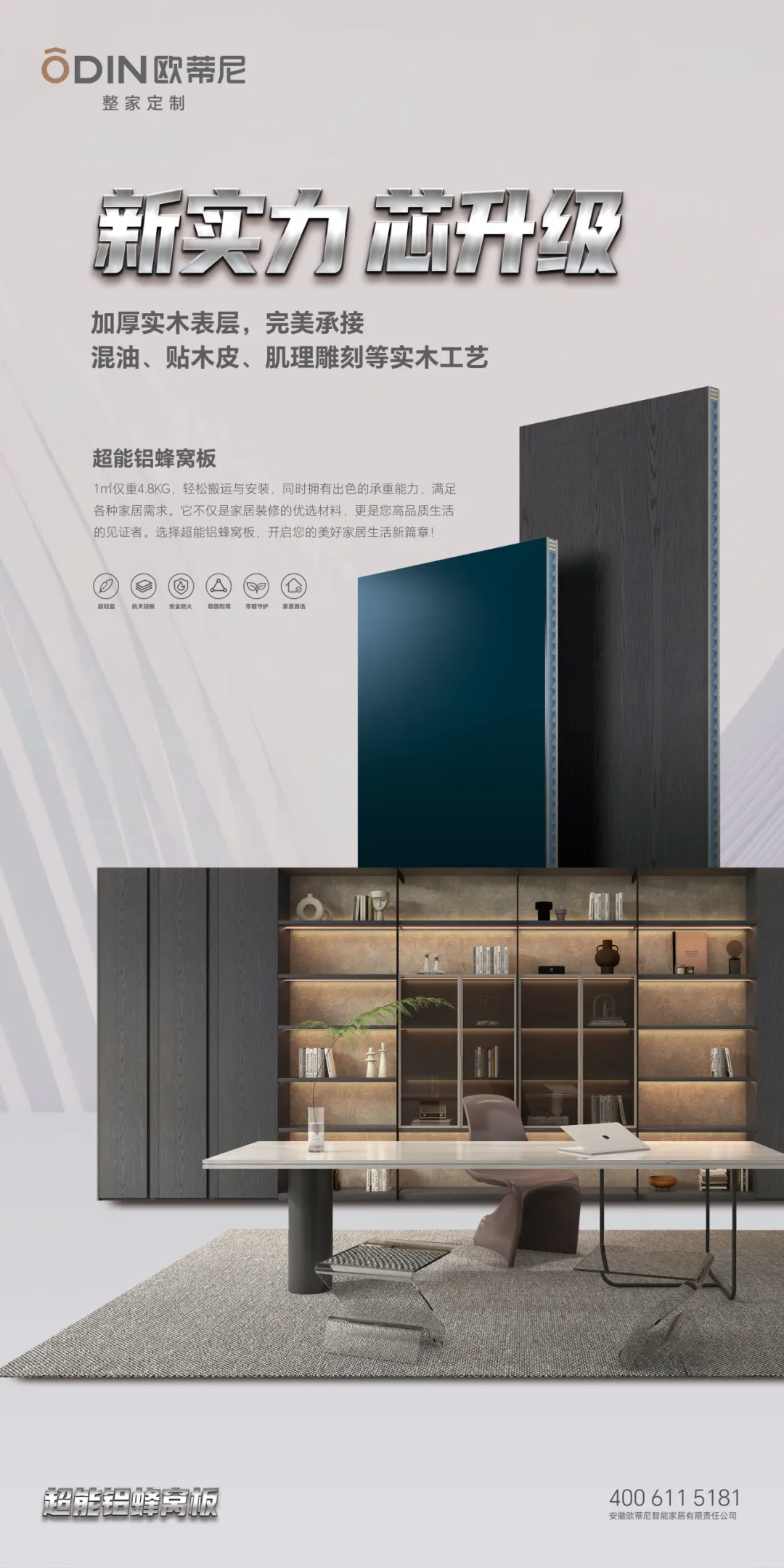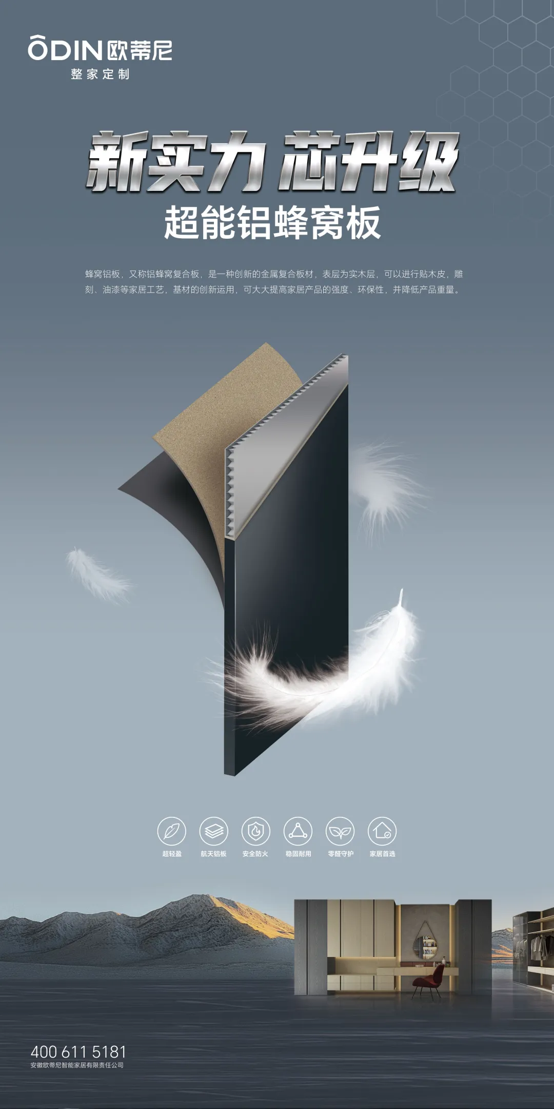 超能鋁蜂窩板,是歐蒂尼家居對(duì)高品質(zhì)生活的又一次致敬。它以輕盈之姿,承載家居之重,不僅滿足了現(xiàn)代家居對(duì)美觀與實(shí)用的雙重需求,更以超凡的性能與獨(dú)特魅力,為您的家居生活增添了一抹亮麗的色彩。