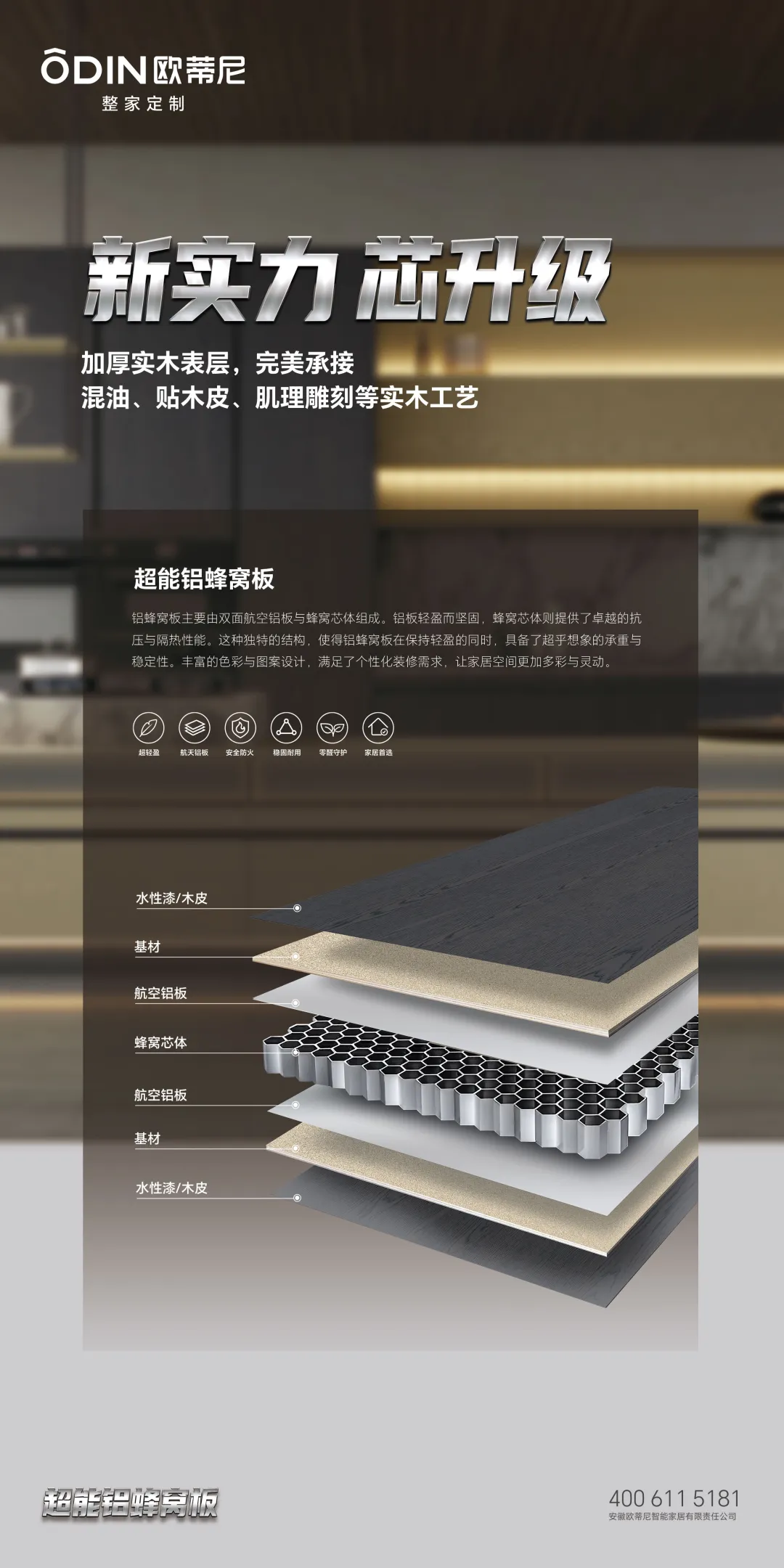 在追求高效與美學(xué)的現(xiàn)代家居時(shí)代,歐蒂尼以「輕高定」戰(zhàn)略走在行業(yè)前端,而材料的革新無疑是推動(dòng)家居設(shè)計(jì)進(jìn)步的重要力量。為此,歐蒂尼重磅推出水漆涂裝門板基材鋁蜂窩板——「超能鋁蜂窩板」。該產(chǎn)品采用「蜂窩矩陣結(jié)構(gòu)+水性漆工藝」雙核驅(qū)動(dòng)技術(shù),打造集環(huán)保、性能與美學(xué)于一體的家居解決方案。