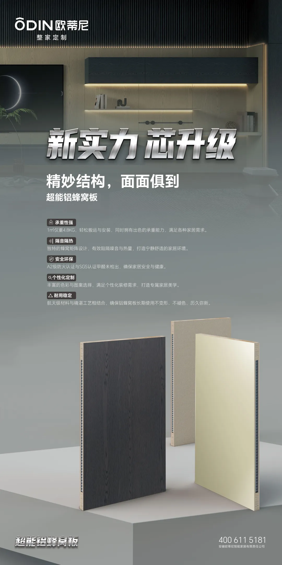 作為革新主角的歐蒂尼超能鋁蜂窩板,它不僅重新定義了家居材料的性能標(biāo)準(zhǔn),更以材料科學(xué)賦能設(shè)計(jì)自由,讓家居解決方案從此突破傳統(tǒng)桎梏,更以其獨(dú)特的魅力引領(lǐng)著家居裝修的新風(fēng)尚。下面,為大家重點(diǎn)介紹歐蒂尼的這款——超能鋁蜂窩板的核心優(yōu)勢。