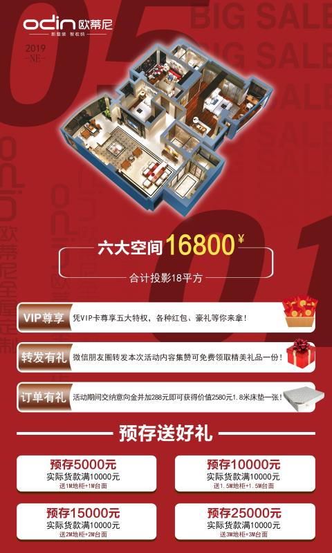 客戶在歐蒂尼門店/歐蒂尼標識下進行視頻/照片拍攝并附帶指定文字:“歐蒂尼全屋定制“5.1大放價”,定全屋送櫥柜,選擇歐蒂尼選擇信任,我為歐蒂尼家居代言!”送小禮品一份(禮品根據(jù)店面禮品情況自行設計)